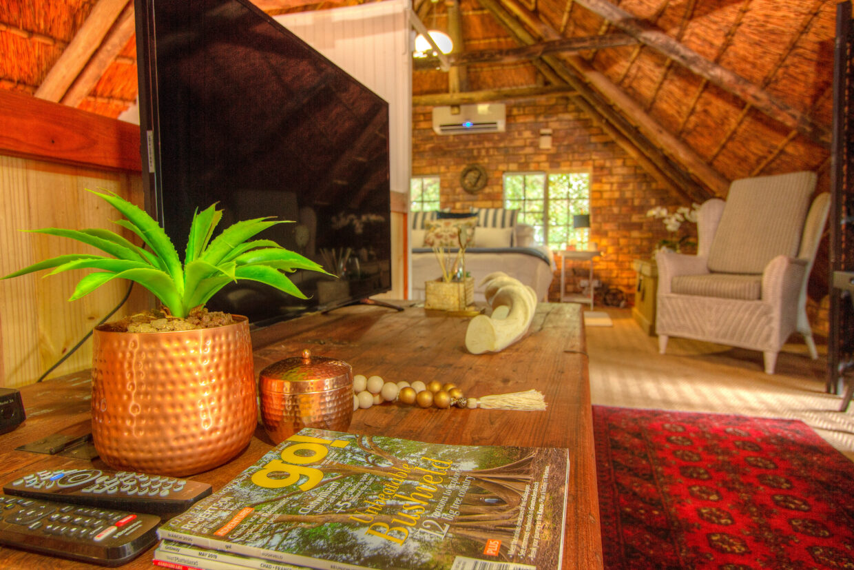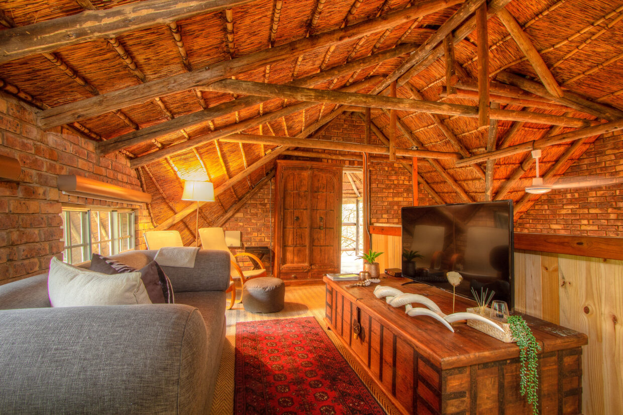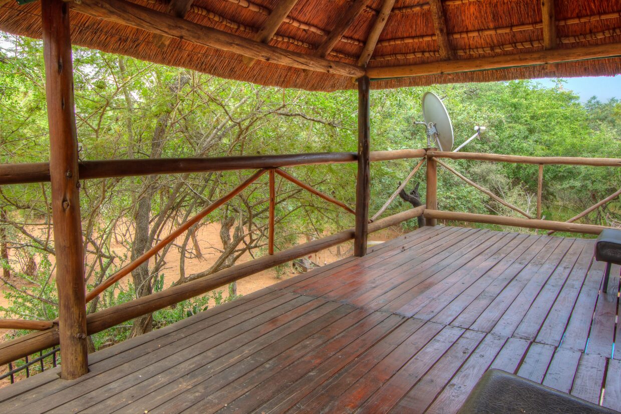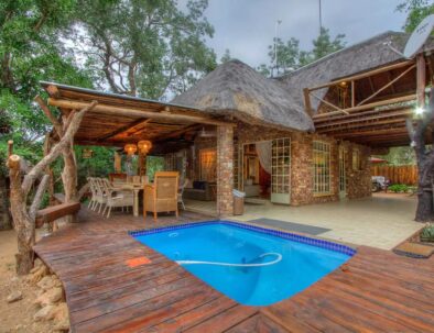This is a small and cozy fully-equipped self-catering double storey house comprising of two 2 bedrooms on the ground floor, both with queen size beds. Two separate bathrooms, albeit not en-suite, are conveniently close to the two bedrooms. Both bathrooms have a shower, basin and WC. An open plan small indoor seating area and a fully equipped kitchen, including a dishwasher, 5 plate gas stove with an electric oven, microwave, ice-machine and large double door fridge and freezer completes the downstairs interior. The loft consists of an open plan space comprising of a room area with a king size bed, a TV snug area leading to a 3rd safari style bathroom on what used to be a viewing deck. This bathroom also consists of a shower, basin and WC. The veranda is equipped with a gas grill, pizza over and a tiny fireplace for the occasional chilly evenings in winter. A built in braai is located just off the veranda. A tiny, sparkling splash pool provides welcome relief from the many really hot and humid days in Marloth Park.